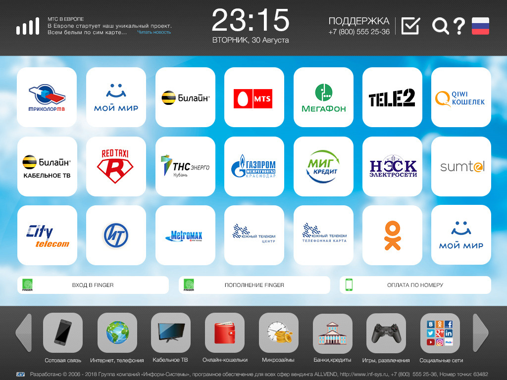 | Описание: | Система SkySend представляет программное обеспечение для платежных терминалов, которое обладает рядом отличительных преимуществ: 1. Современный дизайн, анимированный интерфейс 2. Оплата услуг по QR-коду 3. Интеллектуальная сортировка кнопок оплаты по территориальному признаку и частоте поступления платежей 4. Автоматическое определение оператора связи по введенному номеру телефона 5. Возможность создавать индивидуальные дизайны экранов 6. Автоматическое исправление ошибок в работе купюроприемника и принтера, восстановление интернет-соединения без вмешательства технического специалиста ПО Системы SkySend запускается и работает с флеш-накопителя, который содержит операционную систему и программное обеспечение терминала. ПО автоматически определяет все устройства, благодаря чему его запуск терминала в работу занимает 15 минут! Перевод терминалов на работу с Системой SkySend осуществляется БЕСПЛАТНО. Узнайте все подробности по телефону +7 (800) 555-25-36 или отправив письмо с темой "ПО терминалов нового поколения" на электронную почту sales@inf-sys.ru |